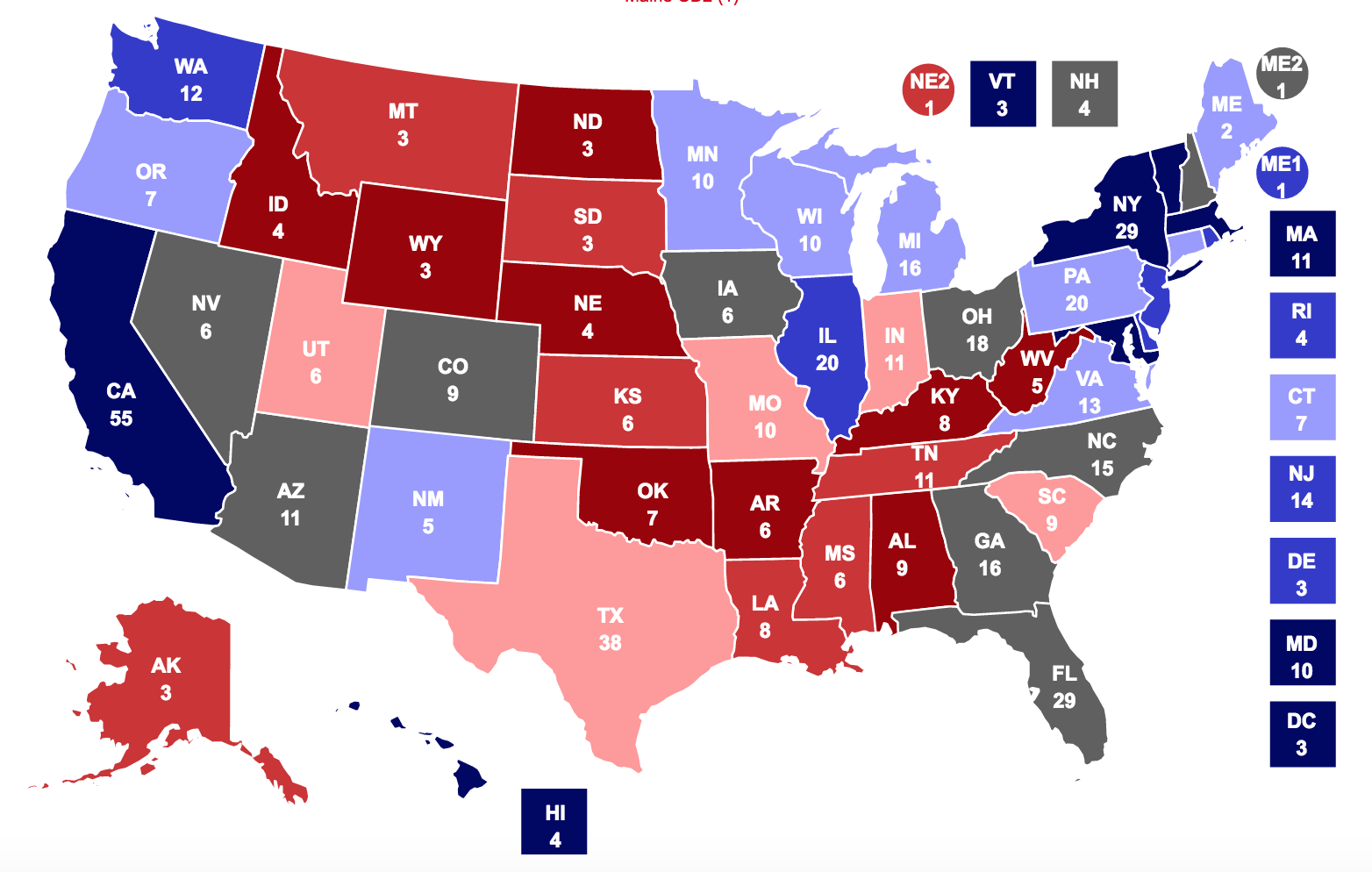 とはいえ、世論調査でトランプが支持率を上回っても、まだヒラリーが優勢であることは変わりません。それは、以前に書いたように、選挙人の多い州を効率良く制しているためです。