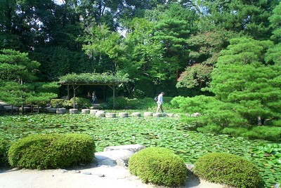 スイレンなんかが咲く大きな池と、そこに架かる橋が有名なお庭です。とても広い庭で、いろいろな植物を紹介するような庭ではじまり、池、川、池、橋。白鷺や鯉など生き物もいっぱい居て自然と融合した感じの気持ちいい場でした。