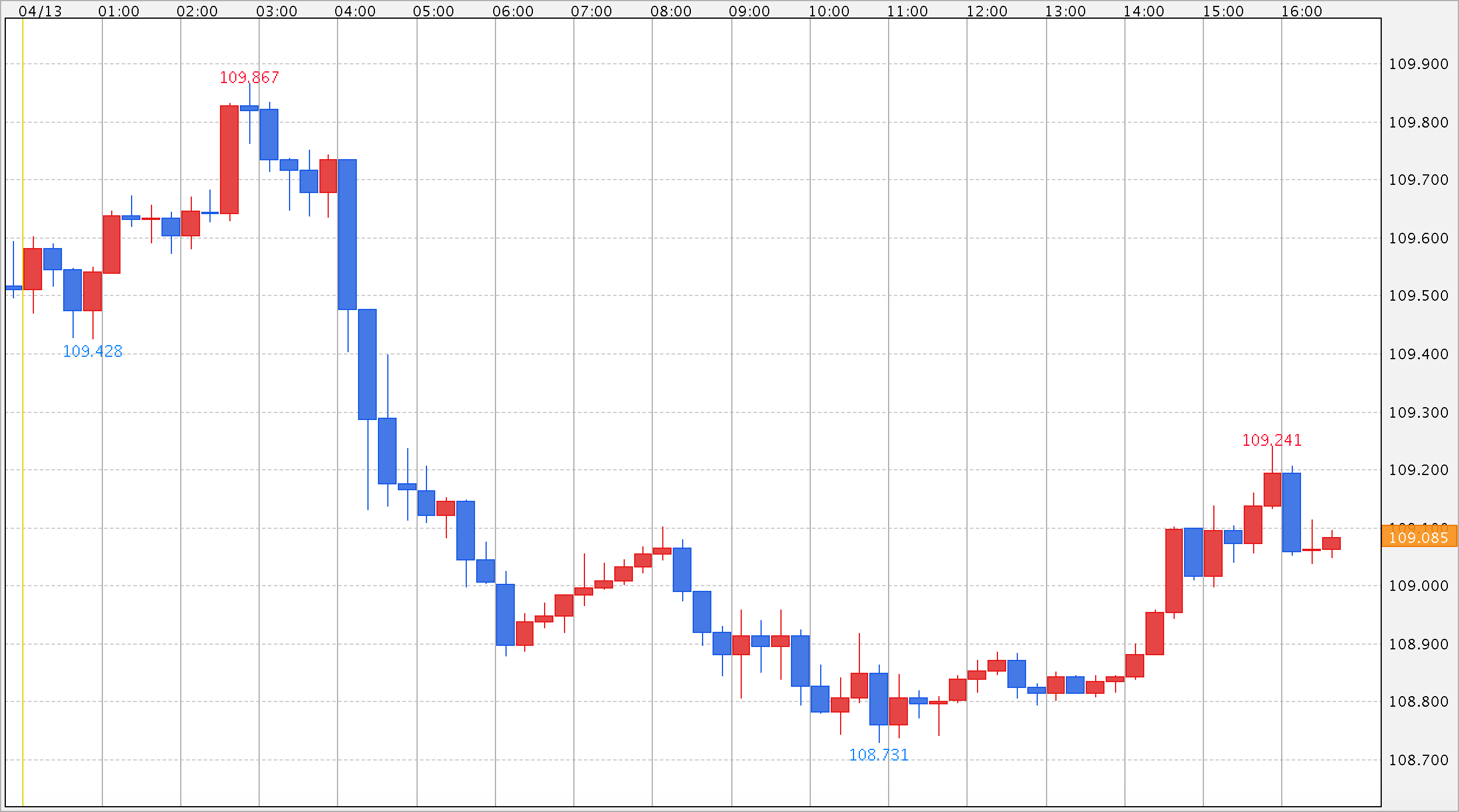 ここまでの値動きについてまとめると、昨日(12日の東京市場は、1ドル=109.30〜109.70円台で弱めの推移となりました。110円台に戻すのが難しそうで、上値の重い展開からジワリと下方向への動きが続きました。