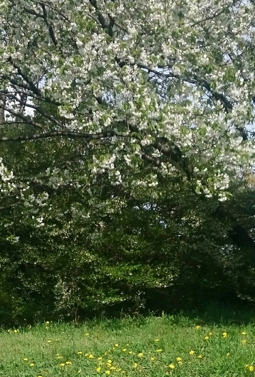 大高緑地公園のまんなか大島桜とどうだんつつじとタンポポが咲いていた。
