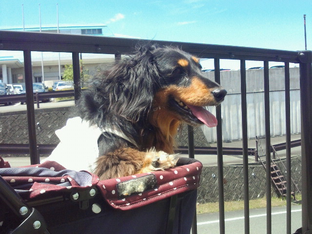 いつもパパさんとカートに乗って、腫瘍が地面に当たるので少しだけの平坦なところにおりて、散歩をしています。