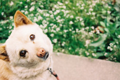 途中素敵な花と隣のゴルフ場から見た少し雲がかかっている富士山をみて、クゥタの喜びの顔をショットです。