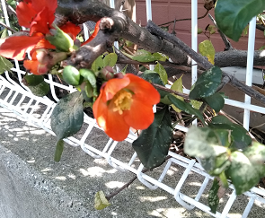 先週はかなり涼しかったのが、日曜あたりから暑いくらいの陽気になったせいか、わが家の木瓜(ボケ)がまた季節はずれの花を咲かせています。