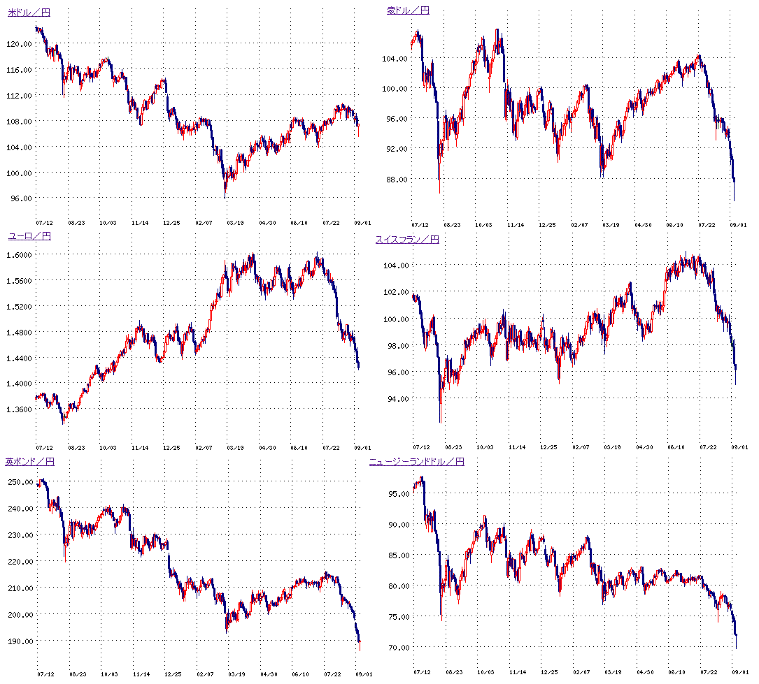 高金利通貨・資源国通貨については、利下げ打ち止めが見えてくるか、資源価格の下げ止まりが見えてくるかしないと、なかなか底打ち感が出ないんじゃないでしょうか。チャートを見ても、特にユーロ、豪ドルは、2000年あたりから大相場になってますから、調整も長引きそうです。