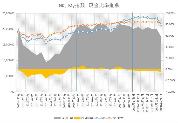 My指数は、現金+株式投資時価=総投資時価の推移を指数化したもので、