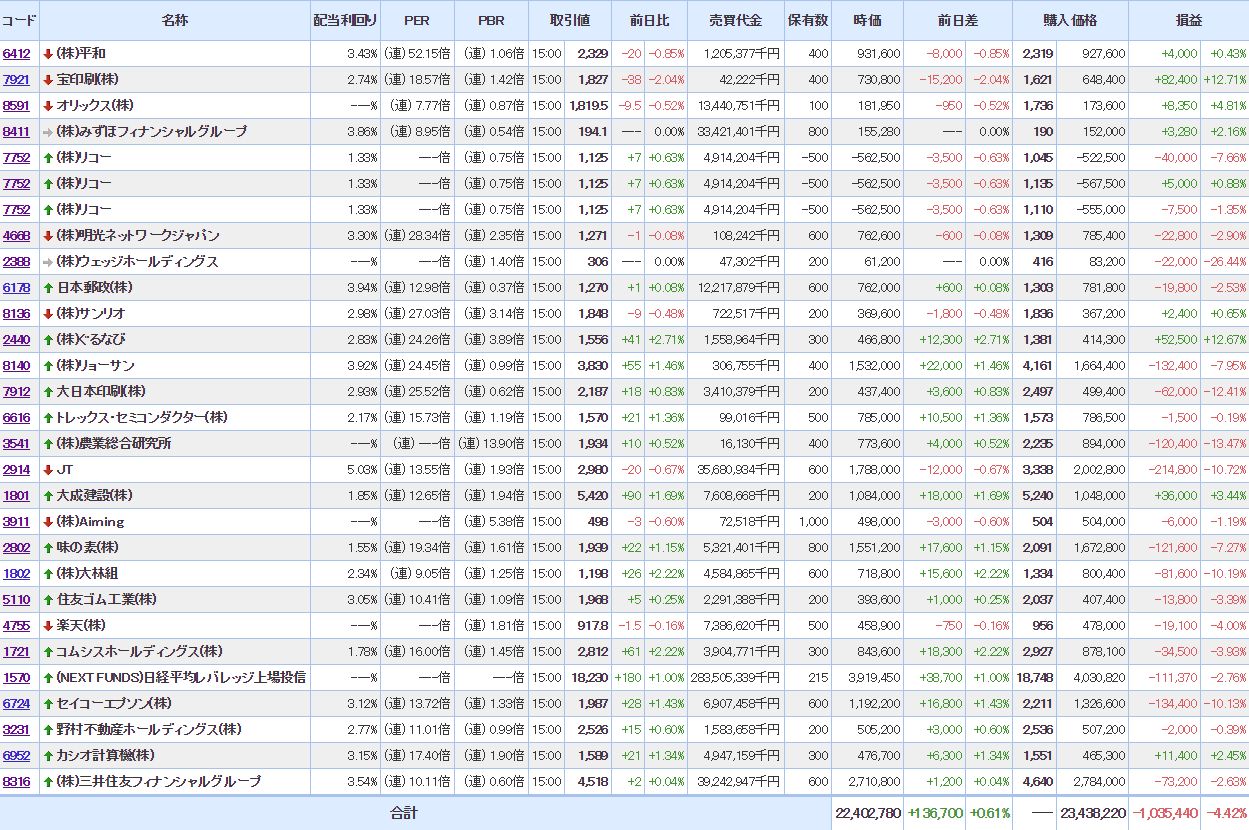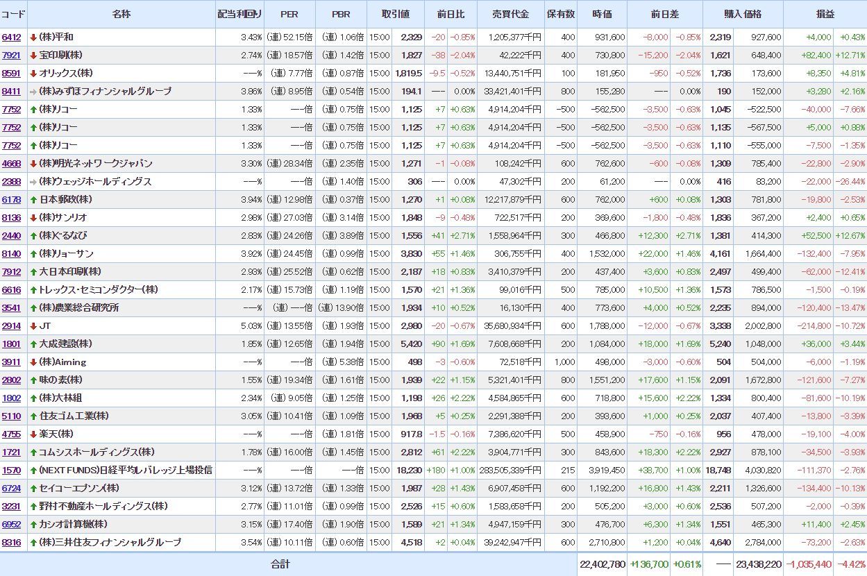 ずっと相場に張り付いていることができたなら、指値を変えて、処分していただろう。残念。でも、週明け、大幅上昇するのなら結果オーライと言えるのだが。。。兼業投資家の弱点を痛感。専業の人がうらやましいと思った。