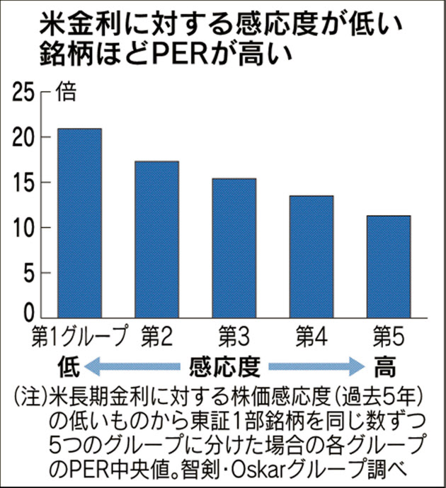 ・例えば株価の決定要因として重要度が増している項目として、米長期金利と株価の感応度がある。米金利との株価感応度が大きい順に東証1部銘柄を5つにグループ分けすると、各グループのPERは米金利との感応度と逆相関の関係になることが分かる。業績より米国の金利のほうが株価には重要ということだ。