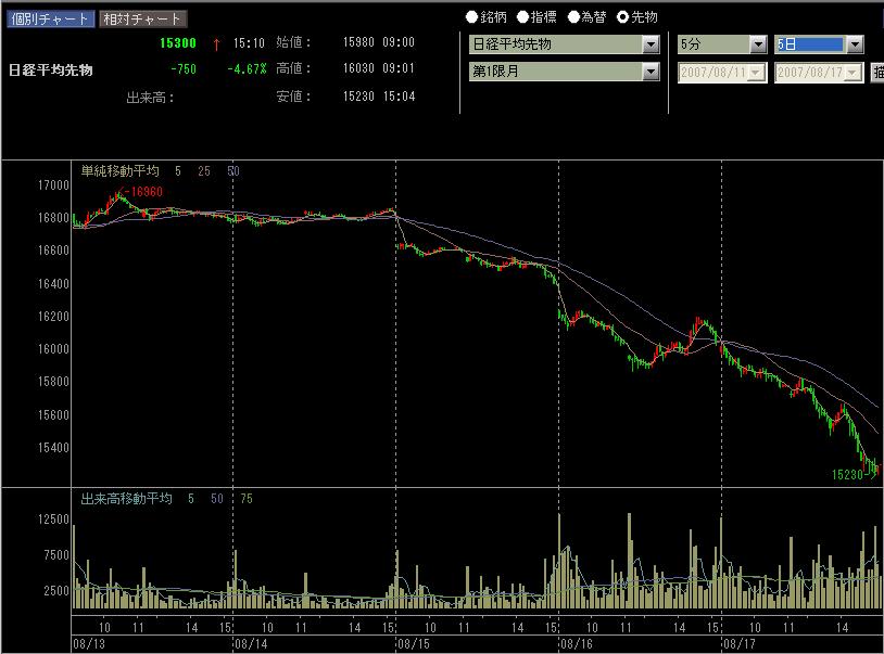 ・日本が夜の間に為替が一気に円高に。CME NK225はそんなに下げなかったのですが、日本市場が耐えたのは寄りまでで、その後は一方的に売られる展開。後場、いつものようにギャップダウンしてその後はしばらく持ちこたえてましたが、次第に下げはじめ午後2時以降はパニック的な投げ売りの嵐でした。オプションのIVも見たことの無いような水準まで上がっていました。(私のプット売りのポジションもひどいことになりました)