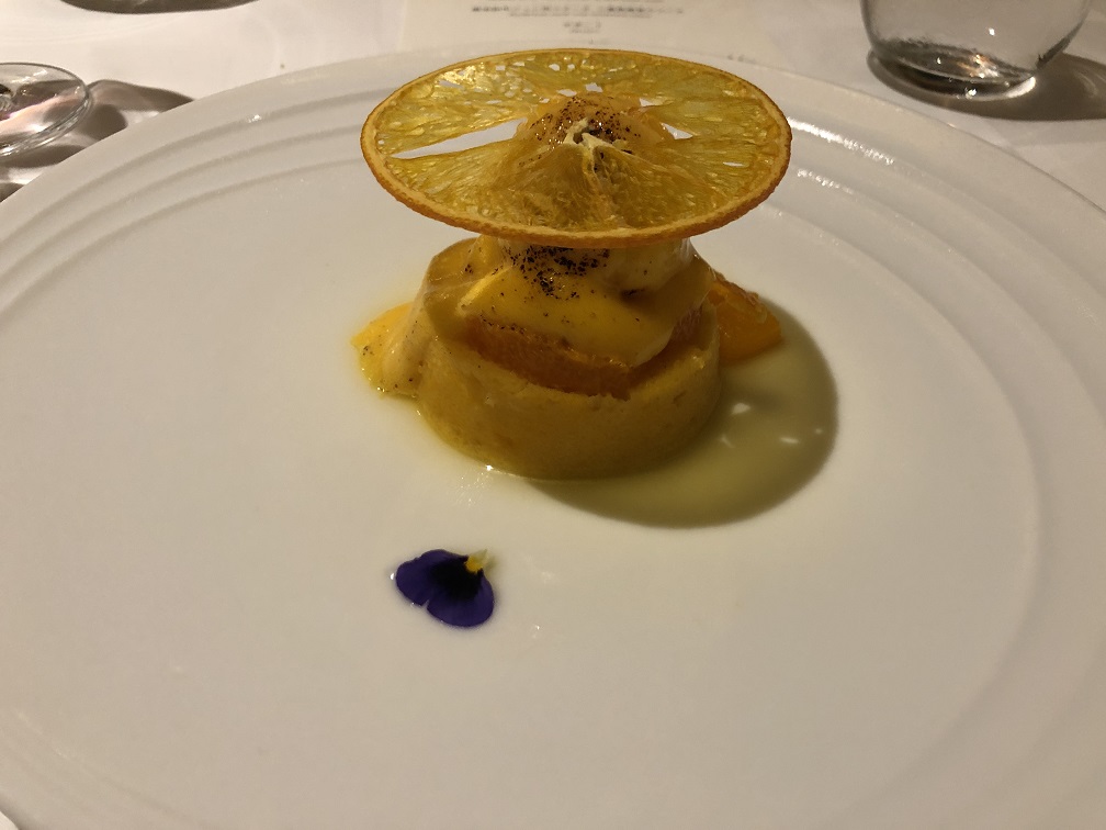 鮑のステーキと牛のステーキ、お菓子は絶品、オレンジは米国産で洋酒はフランス産と