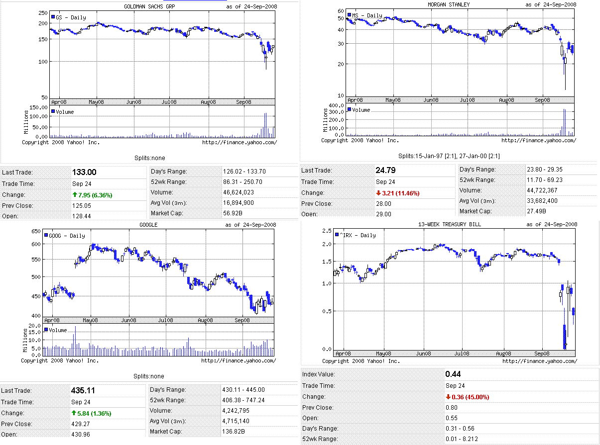 米株は小動き。不良債権の買い取りを含めた金融安定化法案について議会での調整が続いていることから、様子見ムードとなりました。バークシャーハサウェイの出資と公募増資を発表したGSの株価は上昇。短期国債の利回りは低下していて、警戒感はまだまだ強いようです。