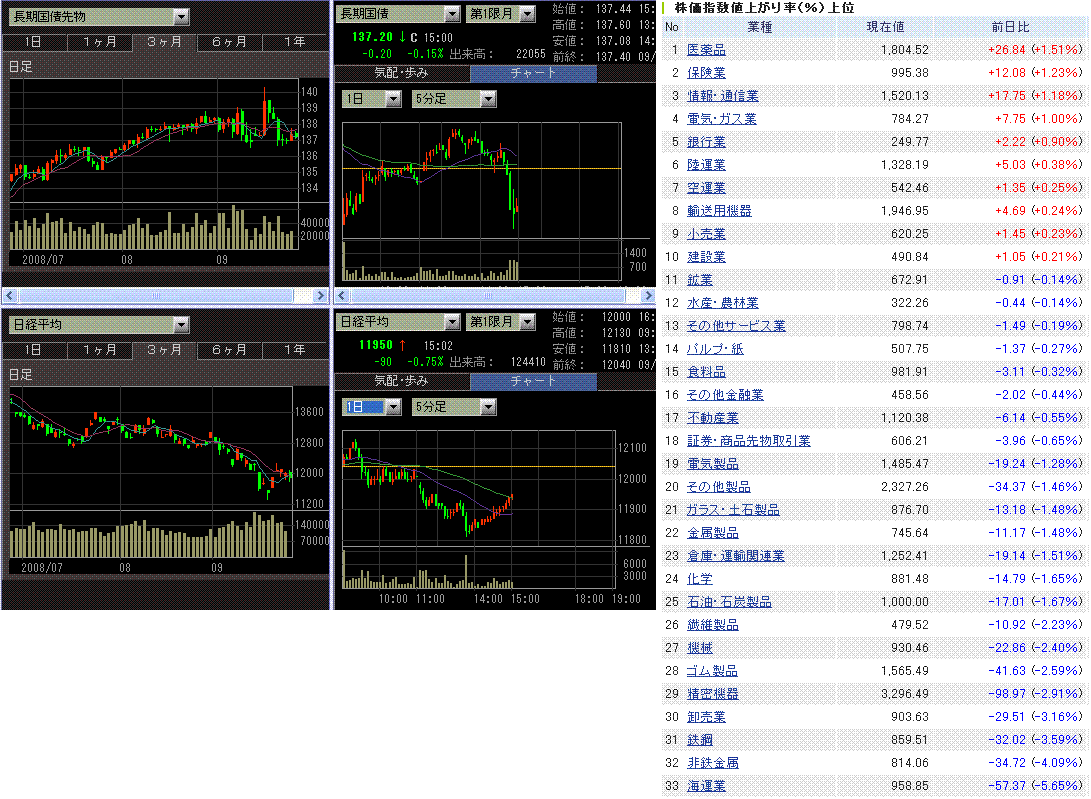 耐久財受注、新築住宅販売、新規失業保険申請件数が発表され、いずれも悪い内容でしたが、金融安定化策について基本合意に達したと報じられ米株は大幅高となりました。ただ、引け後に議員から金融安定化策は合意に至っていないことが明らかにされ、GLOBEX米株価指数先物は大幅安となりました。また、米貯蓄金融大手のワシントン・ミューチュアルが破綻し、JPモルガンが事業を買収することが発表されました。