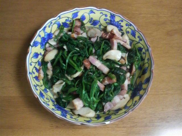 2枚目は「ベーコン、ほうれん草、エリンギ炒め」。一応オリジナル。鶏がらスープと塩、こしょう、醤油で味付け致した。別の日に作った品ながら、合わせてご紹介させて頂きまする。