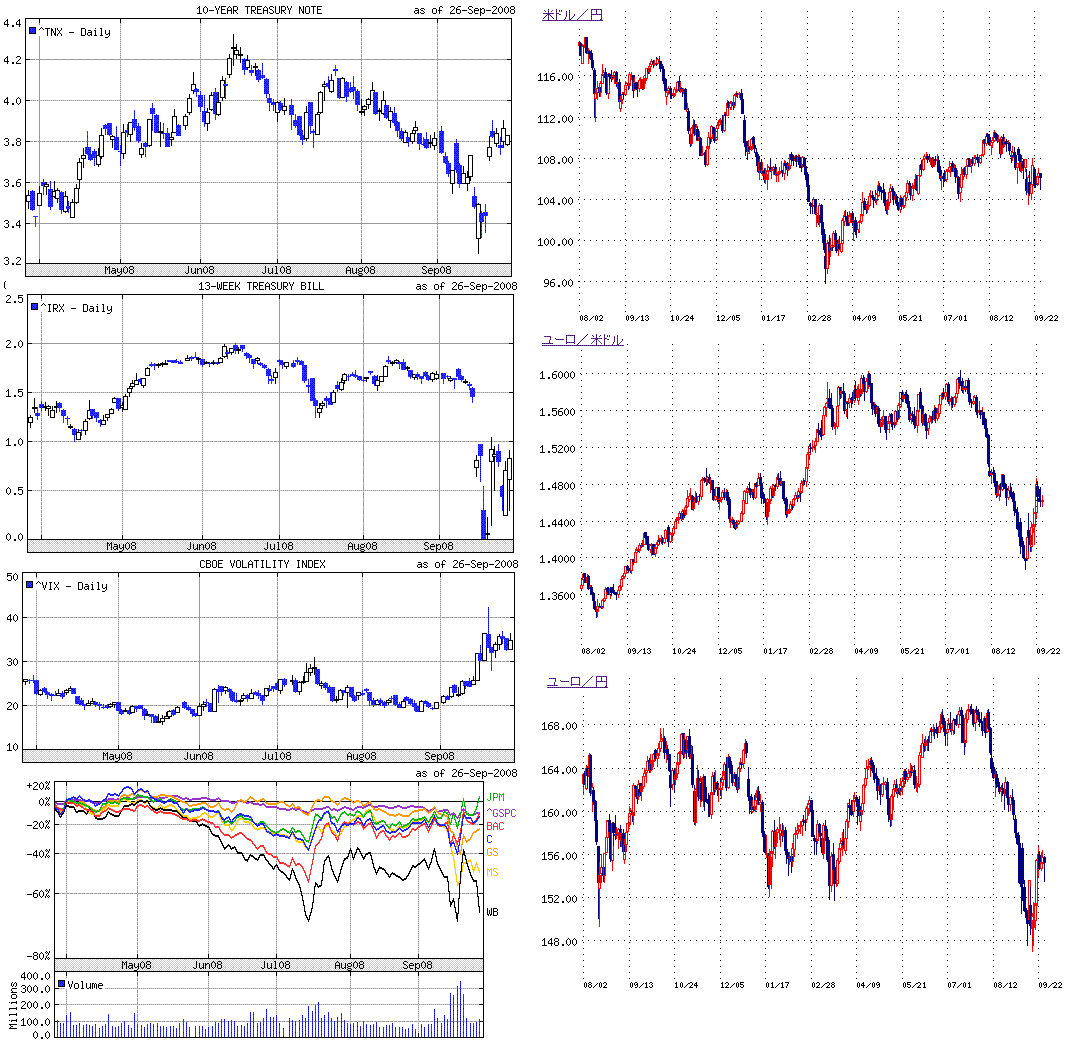短期国債、LIBORなどまだまだ異常な状況で、金融市場の緊張は続いています。私のプロフィール欄にリンクを張ってある「参考サイト-その1-」に、短期国債利回りやTEDスプレッド(3ヵ月米国債利回りとLIBORのスプレッド)のリンクがありますので、興味のある方は参考にして下さい。