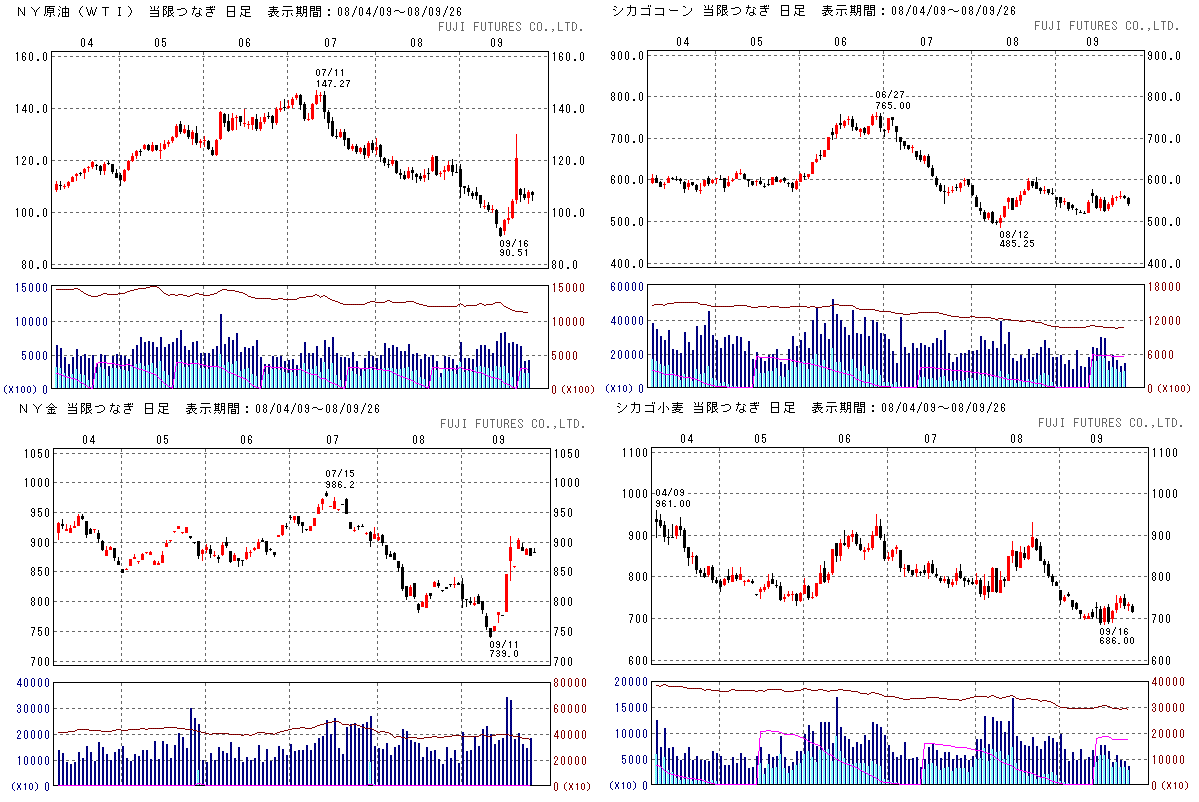 22日に原油先物が急騰しましたが、これは10月限の最終取引日で大口参加者がショートポジションを一気に買い戻したことが原因のようです。原油価格はそれ以降はほぼ横ばいでした。金価格が高止まりしているのが、ドルへの不安を表していると思います。