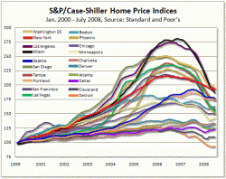 米格付け会社スタンダード・アンド・プアーズ(S&P)が30日発表した7月のS&Pケース・シラー住宅価格指数は主要十都市ベースで前年同月比17.5%下落し、統計記録のある1987年以降で最大の値下がりとなった。下落は19カ月連続。