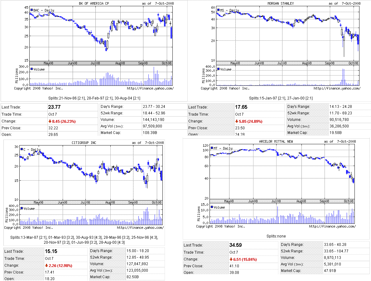 引き続き金融不安と景気先行き懸念が嫌気され米株は大幅続落。投げ売りの連鎖が止まらない状況となっています。バーナンキFRB議長は利下げを示唆し、FRBはCPの買い取り制度を発表しましたが材料視されませんでした。短期国債の利回りは上昇しました(質への逃避が緩んだ?)。