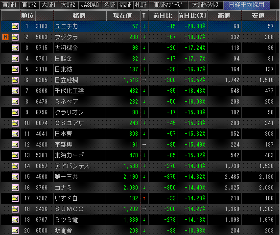 米株安と円高進行により日経平均は大幅続落。ひたすら売られ続けました。東京エレクトロン、日立建機など、日経平均構成銘柄でもS安になるものが続出しました。日経平均のPBRは1.05倍まで低下。バリュエーション面では異常な水準だと思いますが、雪崩のような売りが続き下げ止まる気配がありませんね。。。