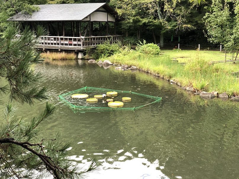 その昔、子供たちが乗ったといわれるオニバスだろうか。移転させられてきた。