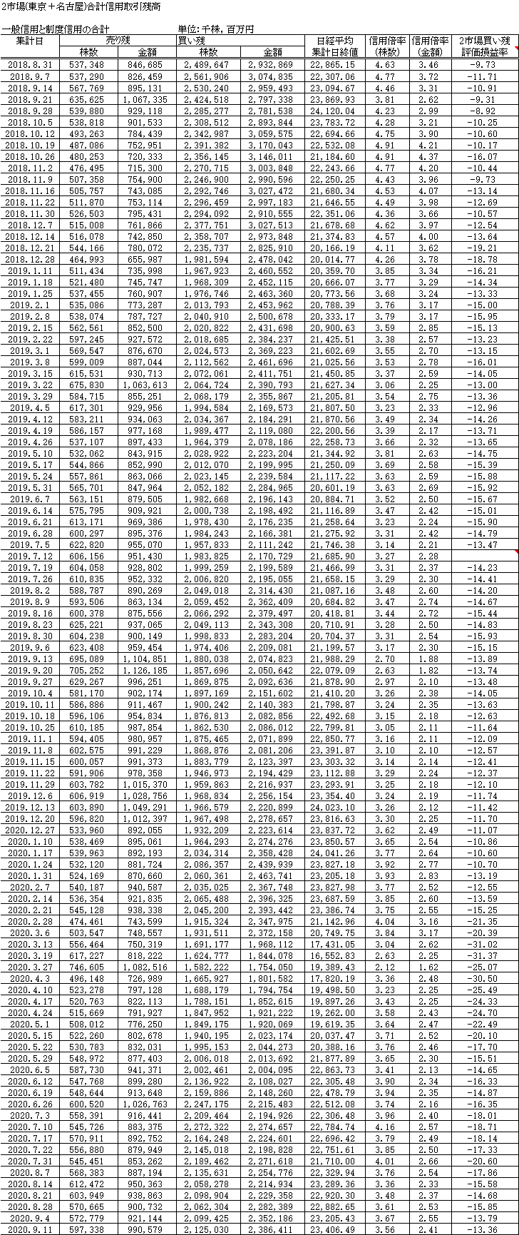で、9/11現在の信用取引残高のグラフです。売り残も買い残も増加しています。信用評価損益率はコロナ前にほぼもどったかなというところ。