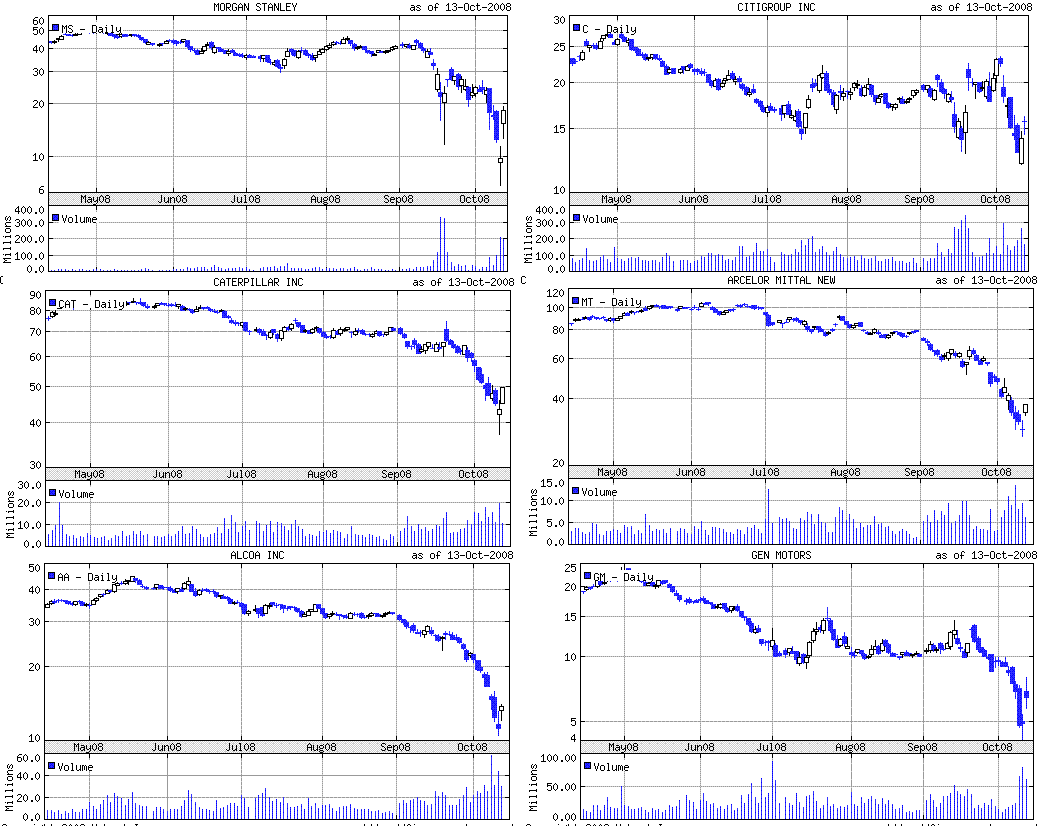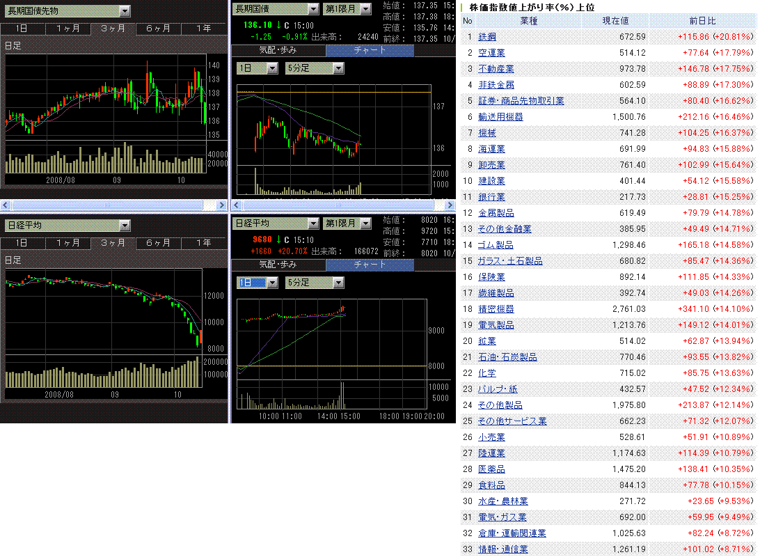 金融危機への各国の迅速な対応が相次いだのを好感し、米株は大幅反発。ダウは過去最大の上げ幅となりました。コロンブスデーで債券市場は休場。今夜以降の動きが重要だと思います。(ショートカバーや買い遅れ組の買いが入るので、株式市場は数日間は強そうですね。)