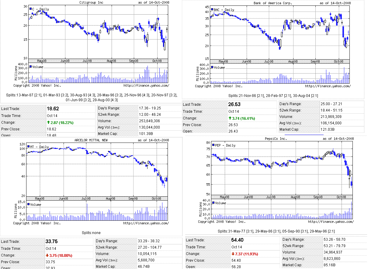 米株は反落。朝方は大幅続伸して始まりましたが、利益確定売りや戻り売りが出たためか、前日比マイナスで引けました。クレディスイスが利益見通しを引き下げたマイクロソフトが売られ、オラクルやグーグルなどのハイテク株も売られたため、ナスダック指数の下落幅が大きかったです。公的資金の注入を好感して、金融株には大幅高するものが目立ちました。短期国債利回りは小幅上昇し、3ヵ月LIBORは小幅低下しましたが、まだまだ異常な水準です。