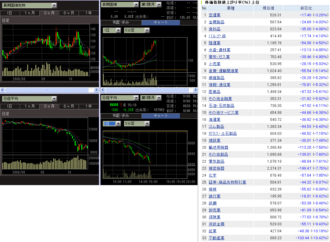 ∇日経平均:8,674.69(-631.56) TOPIX:889.23(-67.41)