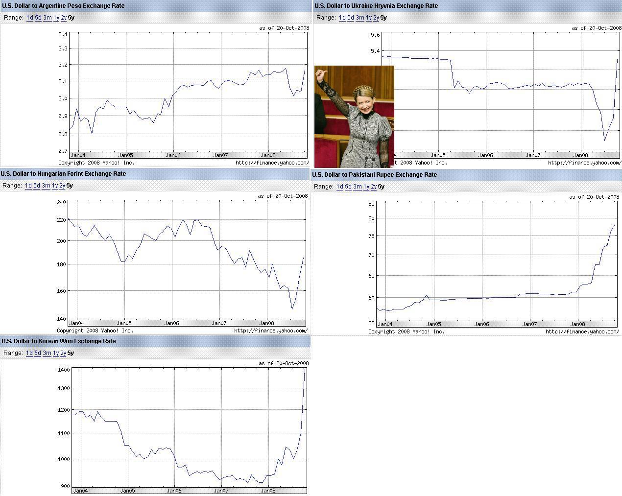 ∇新興国での金融危機。対外債務が多いところは危ないですね。BRICs並になれないところは、それなりの理由があるのだなと。画像2は、新興国通貨の対ドルチャート。アルゼンチン、ウクライナ、ハンガリー、パキスタン、韓国。アイスランドは何故かチャートを表示できませんでした。