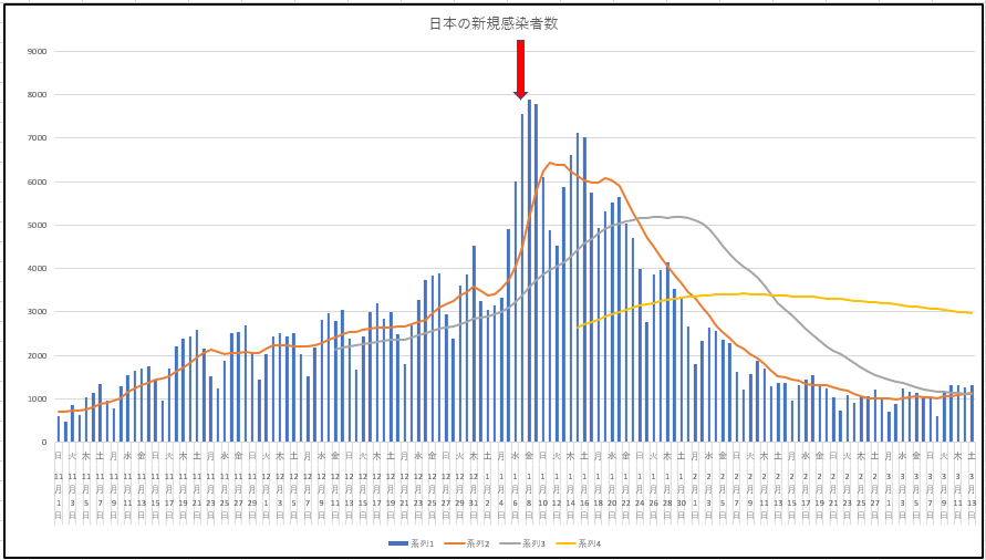 3月13日の日本の新規感染と陽性患者数の推移。減らなくなってる、というか増え始めているように見える。