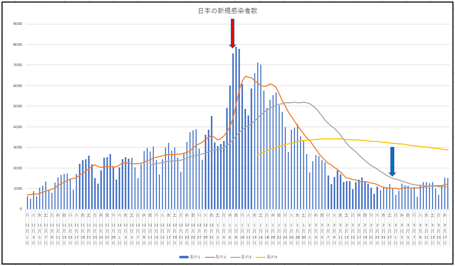 上の赤い矢印は緊急事態宣言の1月7日を指している。