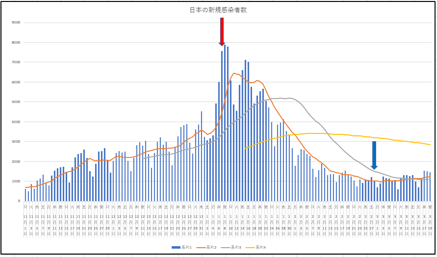 まず東京の新規感染。左端の昨年11月初旬と比べて十分低いといえないが、ここ2日ほど前週の同曜日を下回った。つまり7日移動平均は下降。これを上昇という報道があったのでよく見ると、1週間前の7日移動平均値と比べたら上、ということだそうだが、たしかにそうだ。どちらにしても微動ですが(^^);