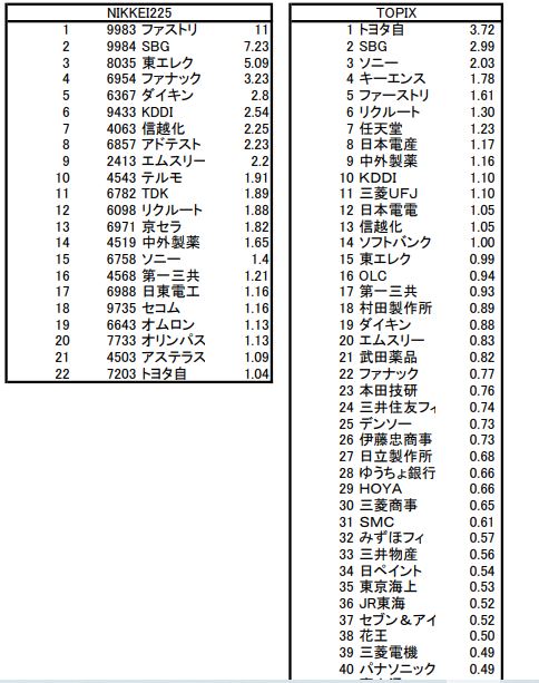 日経225に比べて、TOPIXのウエイトの高い銘柄が 今後期待できるということで、トヨタ、ソニーは良い?ファストリ、東エレク、ファナック、ダイキン、エムスリーは厳しい?SBGはどっちもウェイトが高いがどうなるでしょうか?キーエンス、任天堂、日本電産はどう動くのか?興味は尽きません。