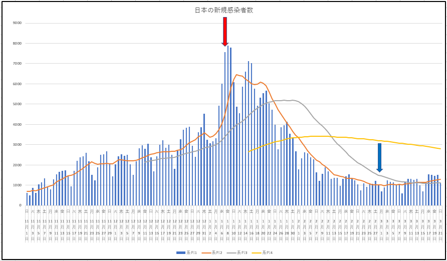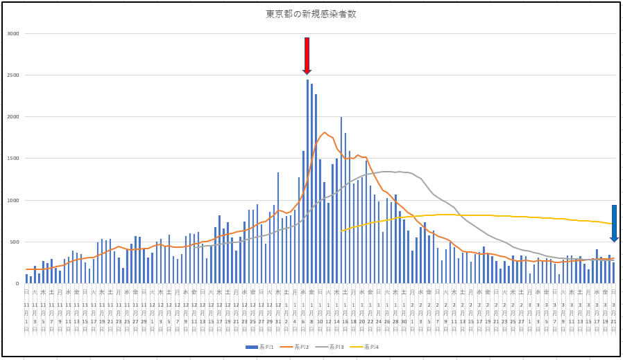 東京都も緊急事態宣言解除になりましたので、青い矢印を入れました。今日からは、東京都と日本の新規感染を並べます。縦軸の数字は異なります。