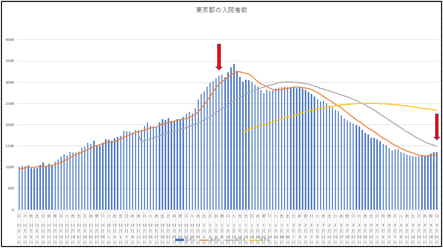 東京都の入院数のグラフの宣言解除の矢印が赤い