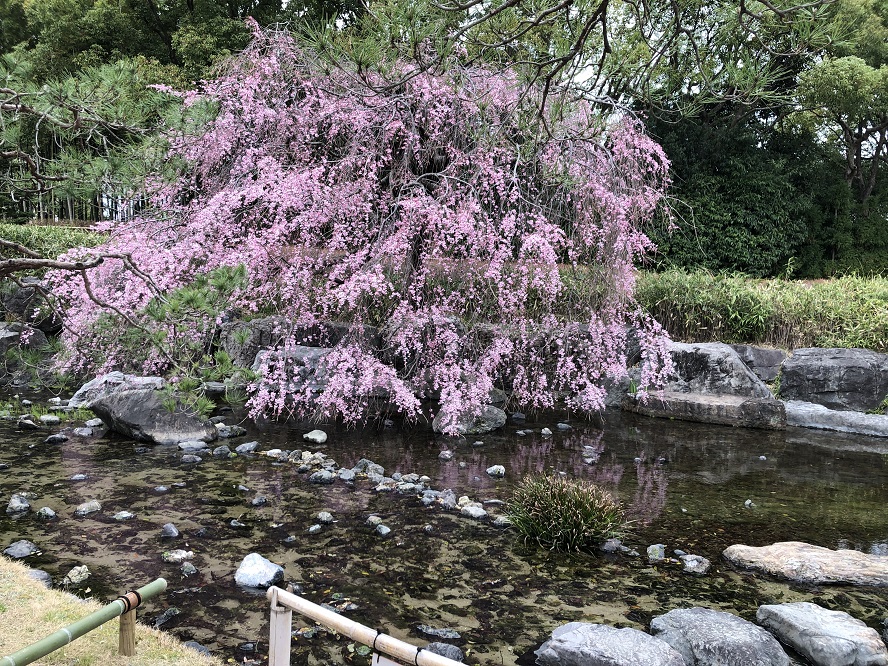 白鳥庭園紅枝垂れ桜が昨日満開。