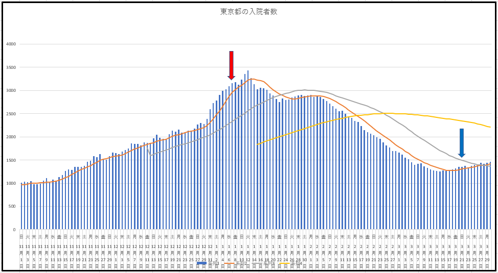 東京都は入院患者数の推移。日本は患者数。