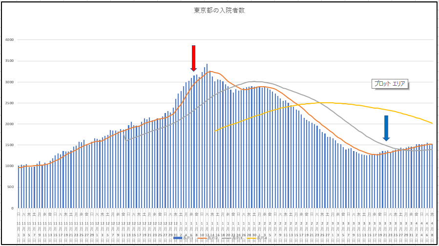 東京と日本の新規。大阪の新規感染はグラフにしてないけど日本全体の内の4分1以上継続中なので日本の傾向は今や大阪(関西)の傾向とみてもよさそう。でも、ご心配なく。東京もすぐ追いつきますよってに(**)b