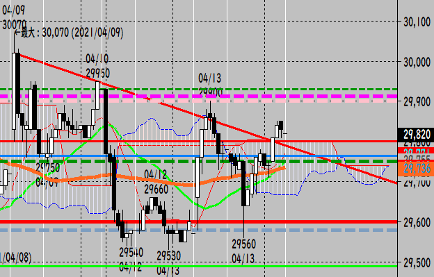 トレンドは継続すると考えるので、本日の想定レンジは孕み足レンジ[29900~29560]。