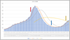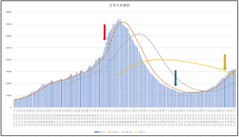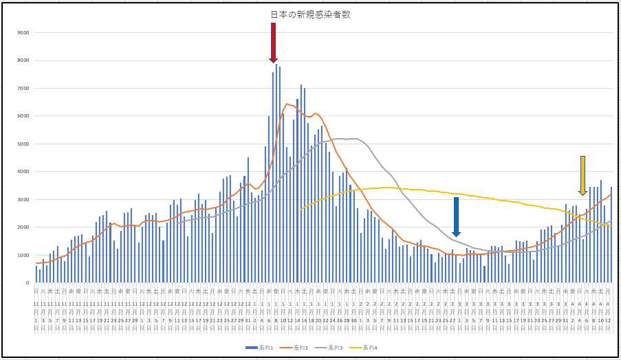 まずは東京都と日本の新規感染者数推移。赤矢印は1月初旬の緊急事態宣言、青矢印は解除の日(日本のほうは大阪の解除の日)、そしてオレンジの矢印はまん延防止等重点措置開始の日(日本のほうは大阪での開始日)。平均線は7、28,84日の各移動平均線。
