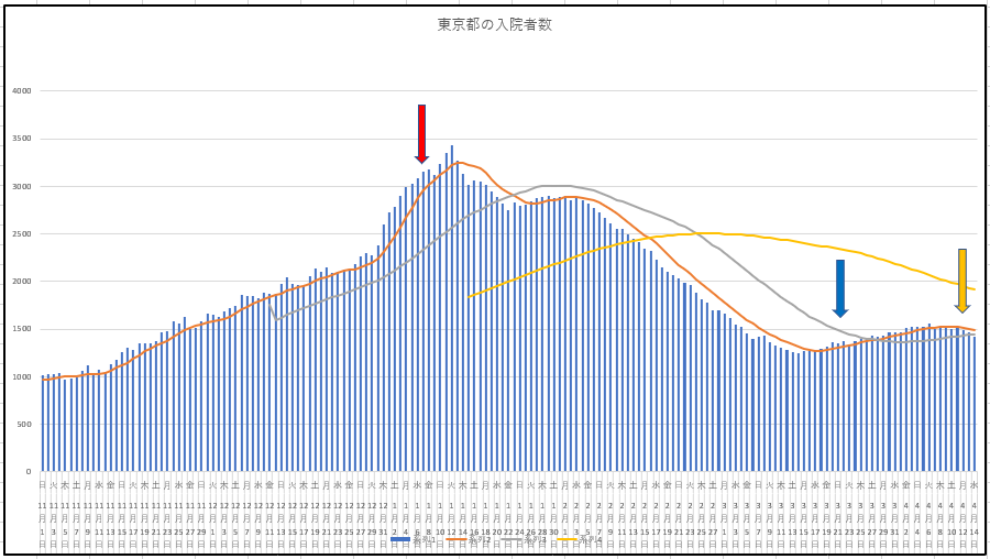 東京都の入院者数は下降トレンド入り?引き続きこの傾向なら大阪のようにはならない。