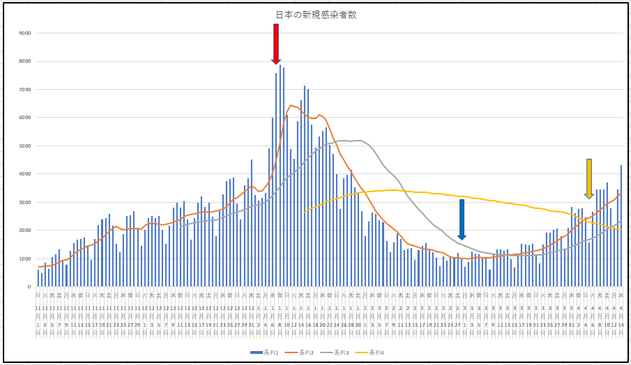 日本の新規と患者数の推移。患者数は明確な上昇トレンドになっている。上記の東京データは、入院数でやや減少傾向だが、現存する軽症、観察中を含めた陽性者数を把握していないので、単純比較はできない。