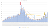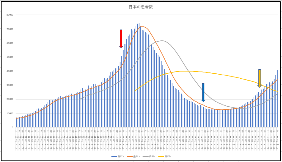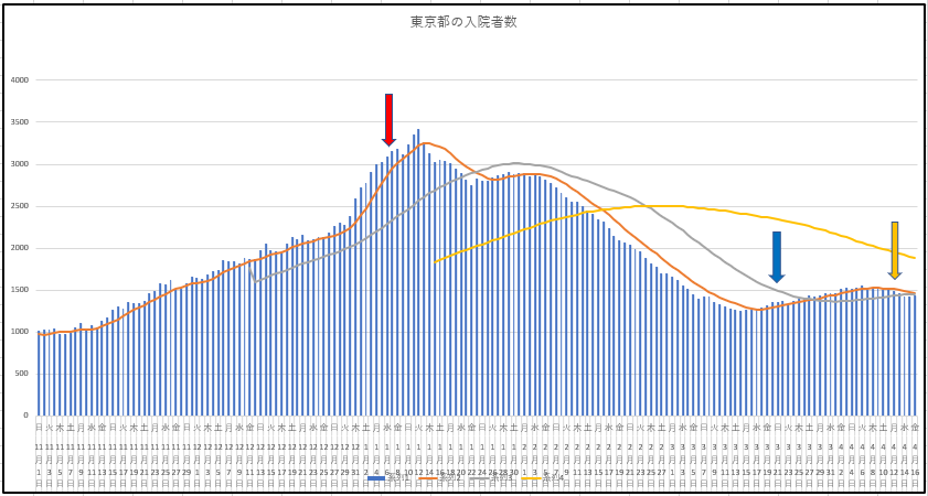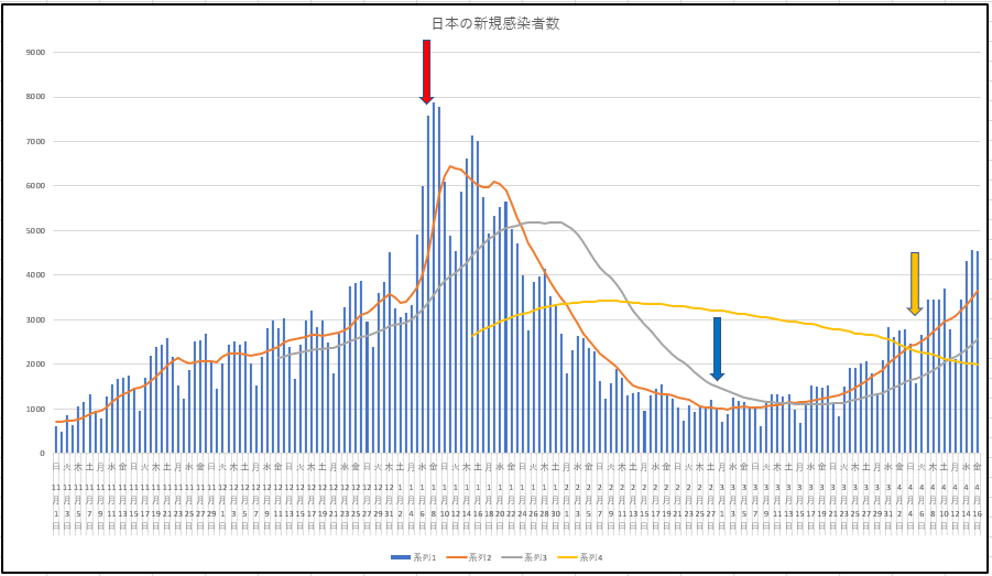 グラフは東京都の新規感染者数の推移。下降トレンドにはならなかったようだ。残念ね。長短期の移動平均線のGCが発生しそう。タグ