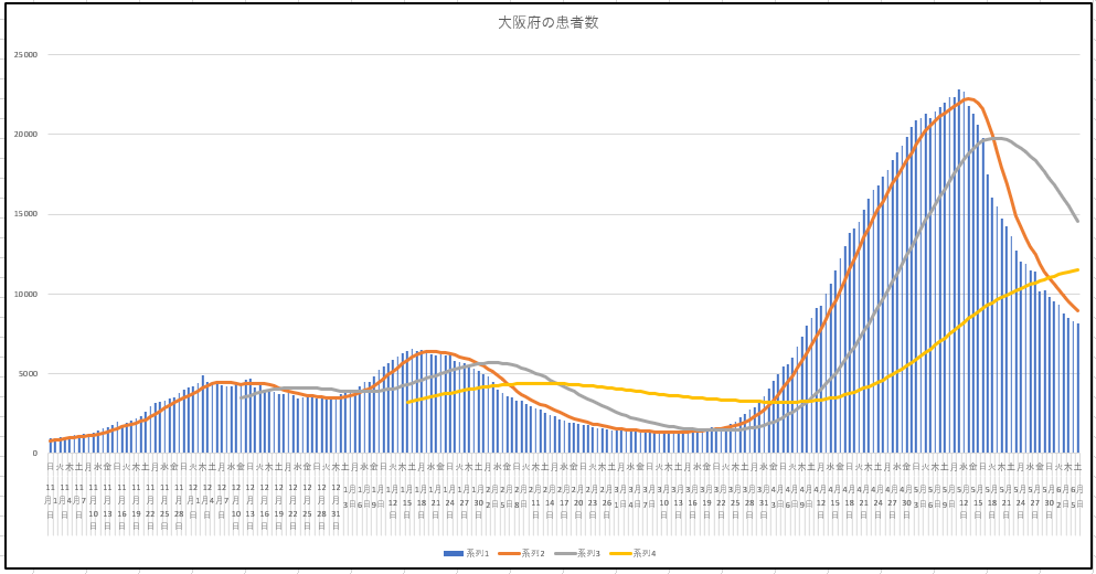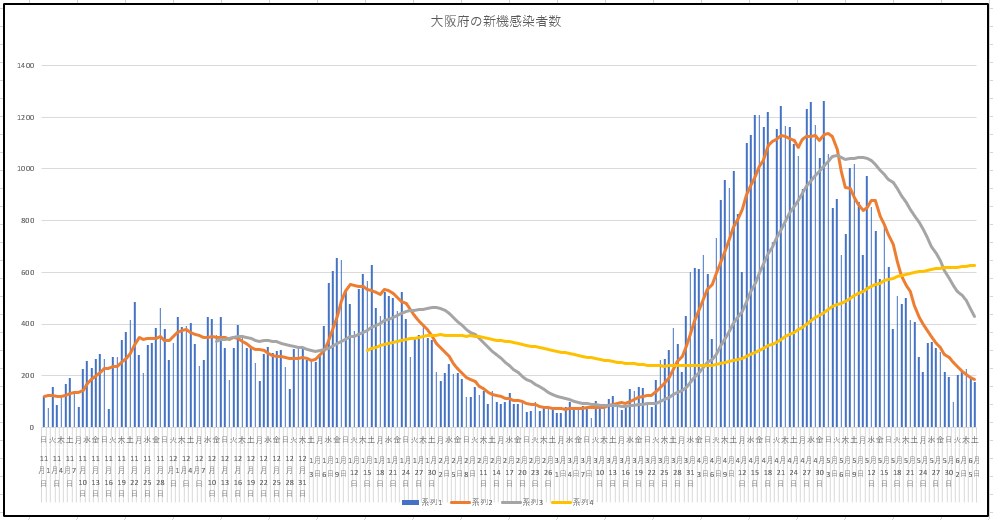 東京都と大阪府の新規感染の推移グラフ。