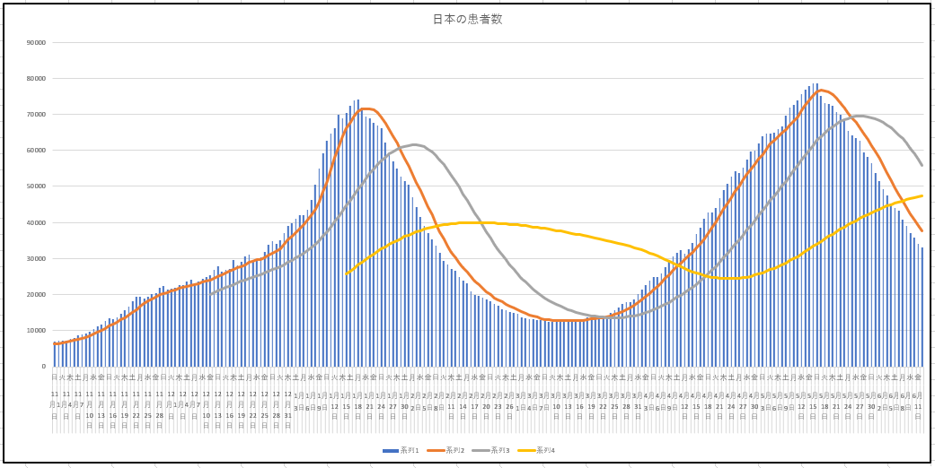日本全国の新規と患者数の推移。こちらも同様な傾向に。