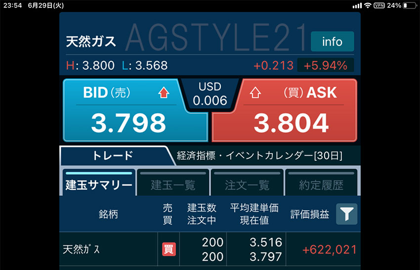 昨夜の記事で報告した「天然ガス」はブログ投稿後も暴騰が止まらず最高3.8ドルを突破(含み益62万円超)しました。