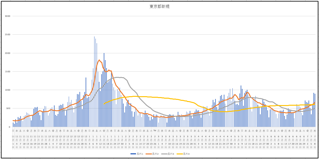 東京都の今日までの新規感染者数の推移。