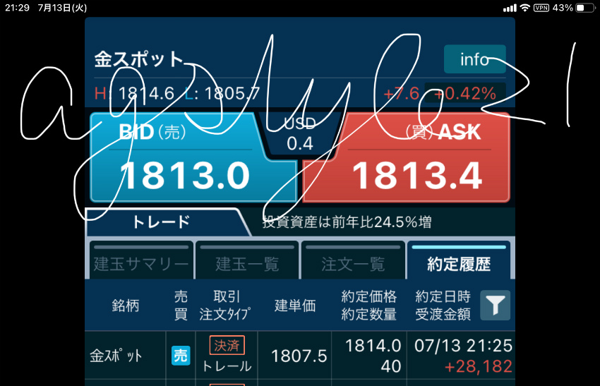 私の判断で購入した金スポットは、私が買うと同時にそれまで調子よく高騰していたものが止まり、レンジ相場に入ったようです。