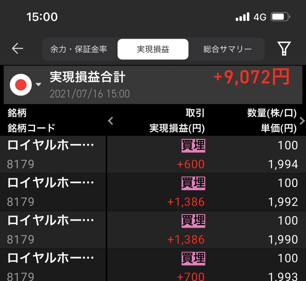 空売り、7/16の実現損益は+9072円