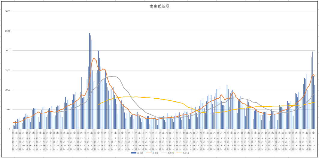 グラフは東京都の7月24日(土)までの新規感染者、現存患者数、