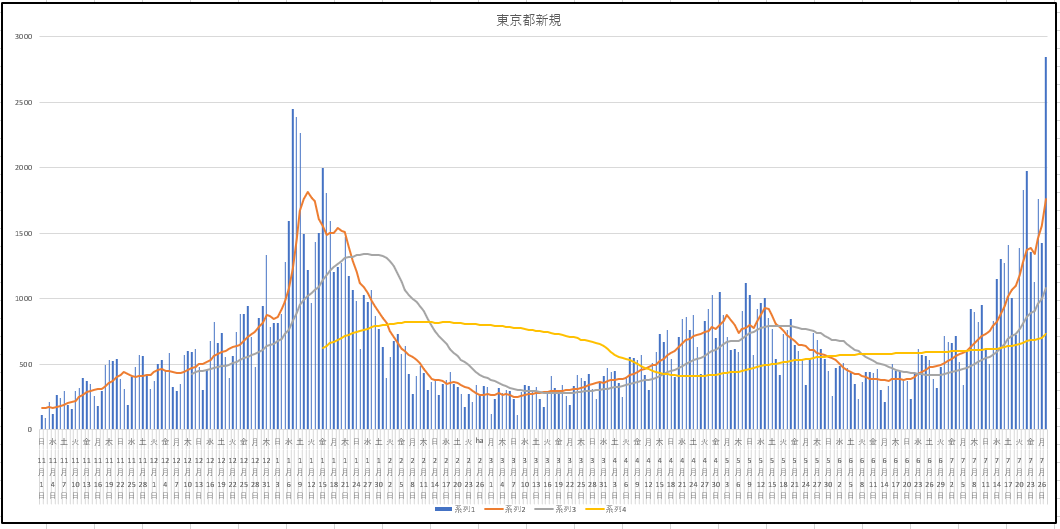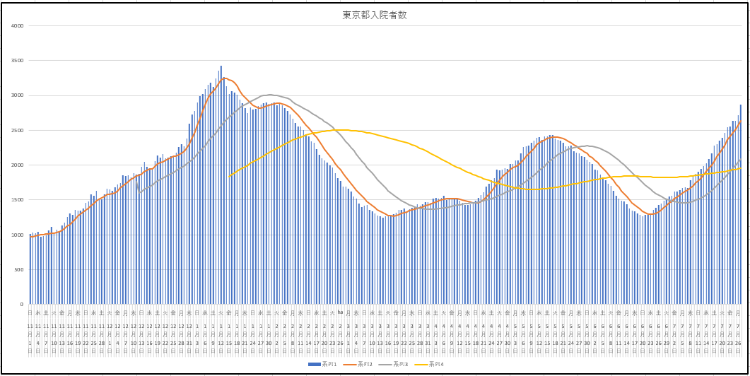 7月27日(火)までの東京都の新規、現存患者数、入院者数。