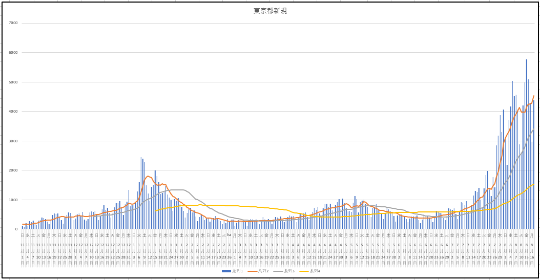 東京都の新規感染、入院患者数、重症者数の推移グラフ。